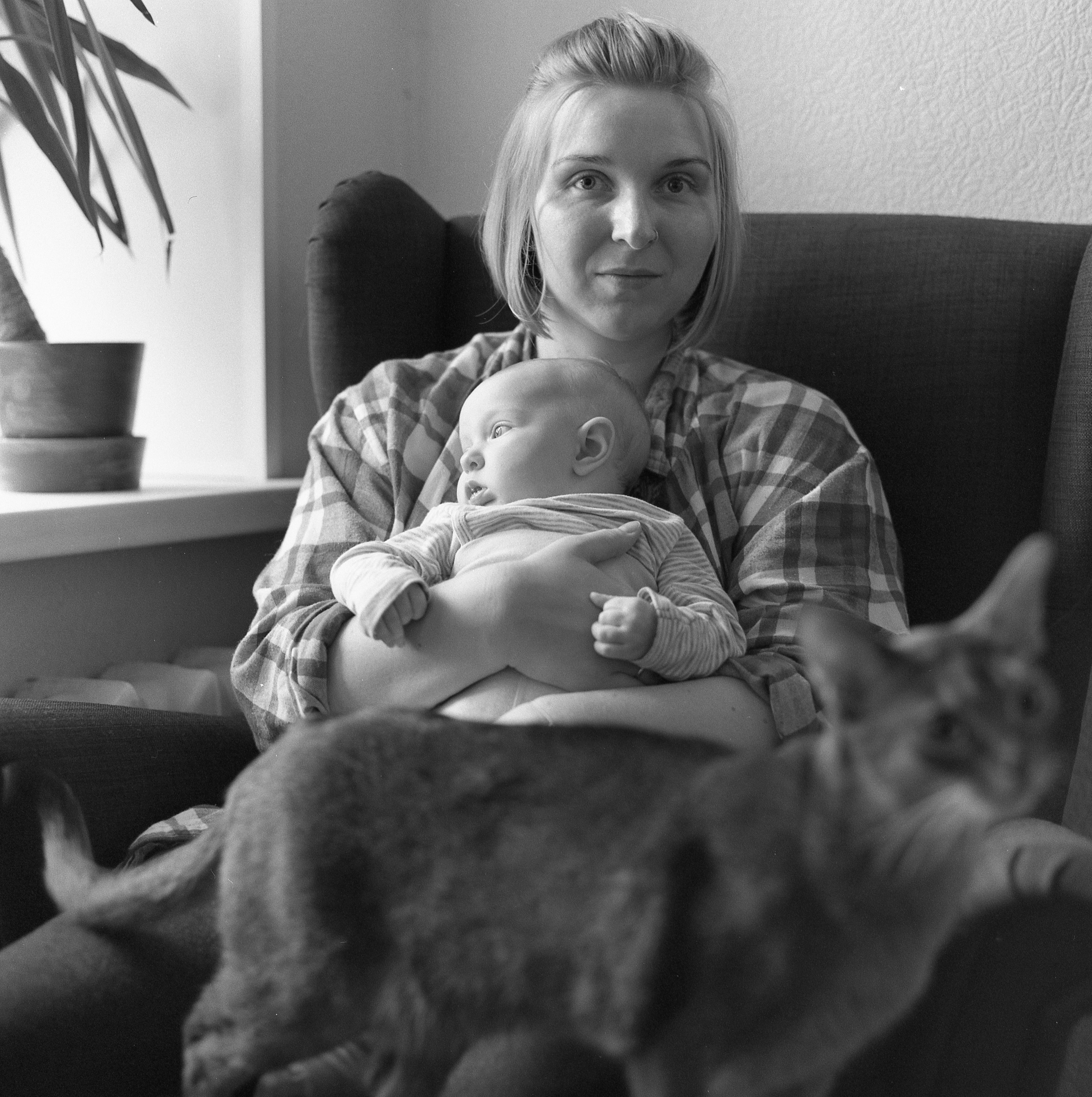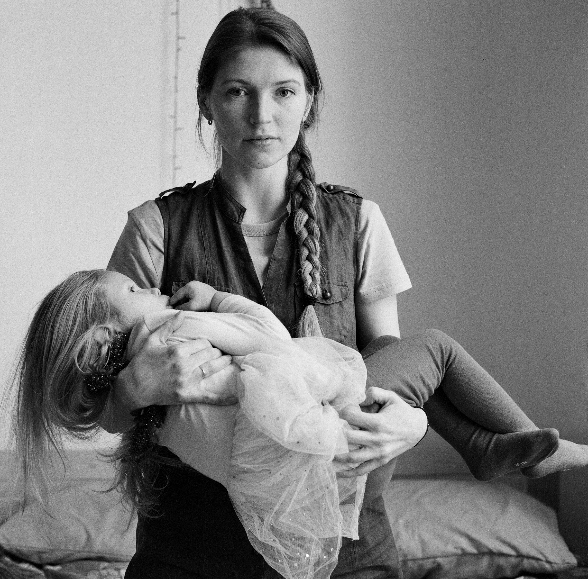 Numerous “ghosts of hidden mother’s work and care“ from archival photos collected by Leskiec prompted Tanya Kilimbet to start creating a personal gallery of female or, to be more precise, maternal images of the “opposite type” – unhidden mothers. Working as a commercial photographer from time to time and receiving orders for photo shoots of mothers together with children she started studying in real time patterns of self-representation of modern women as mothers. Of course, many women tried to “step aside” or on the contrary to support, to hug, to let the main place in the space to a child, to hide behind a child or to express themselves through a child. Such a visualised victory of maternal function over female or to be more precise human nature. Then the photographer started purposeful work with women in order to subvert the secondary role of women set by default by patriarchal culture (reflected through images as well). Without breaking a mother-child tie she tried to shift the focus on the figure of a woman herself with her own (connected with children or not) thoughts, dreams, interests, with her own story. Without devaluing the importance of the mother’s work, she tried to give her models an opportunity to dissolve in motherhood, to become equal to themselves not their children. She proposed them to realise and say out loud not “my children are me”, but “I am (among other) my children.”